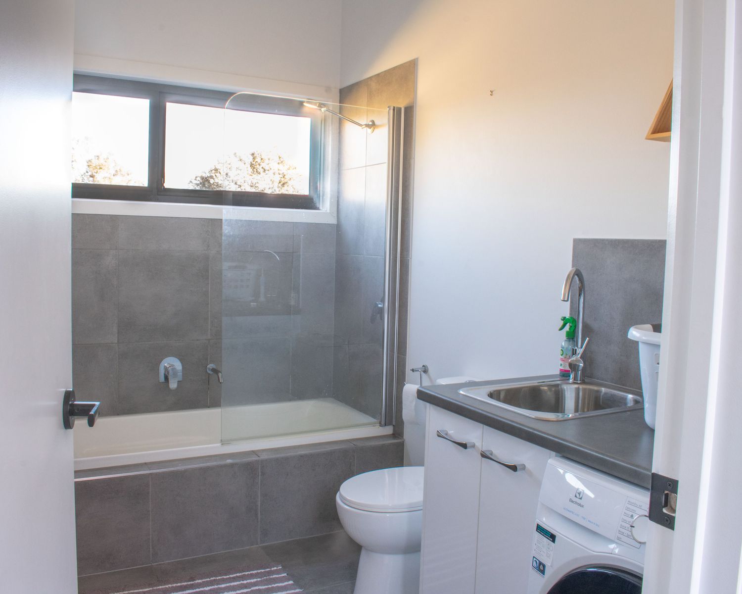Single bathroom with internal laundry, offering a bathtub to soak those mountain-biking or snow-weary muscles - a rare feature in a rental.