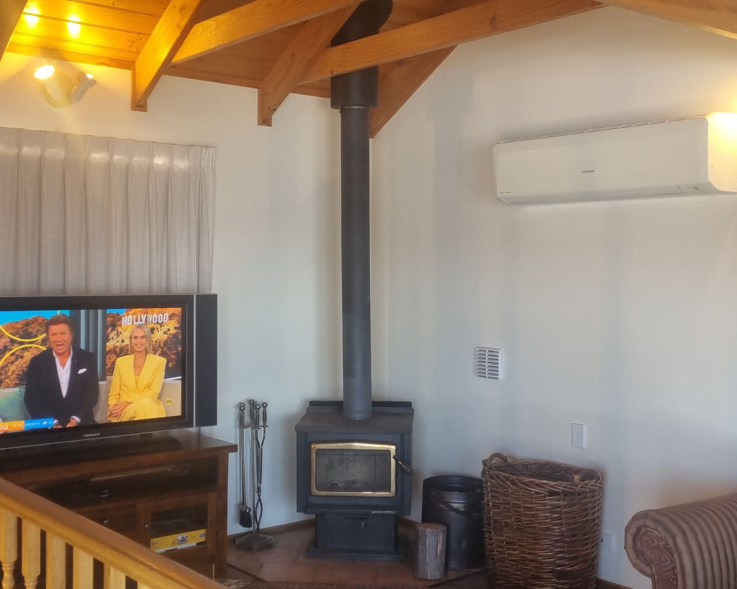 Slow combustion fireplace and reverse cycle air conditioning in the spacious living area